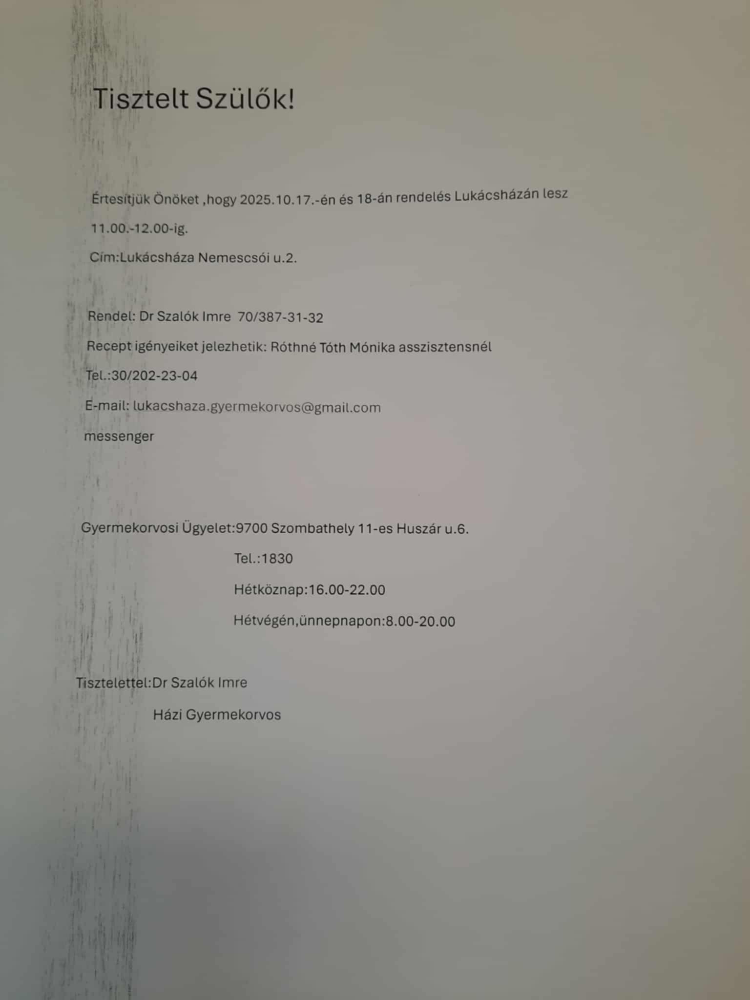 Október 17-18-án csak Lukácsházán lesz gyermekorvosi rendelés!