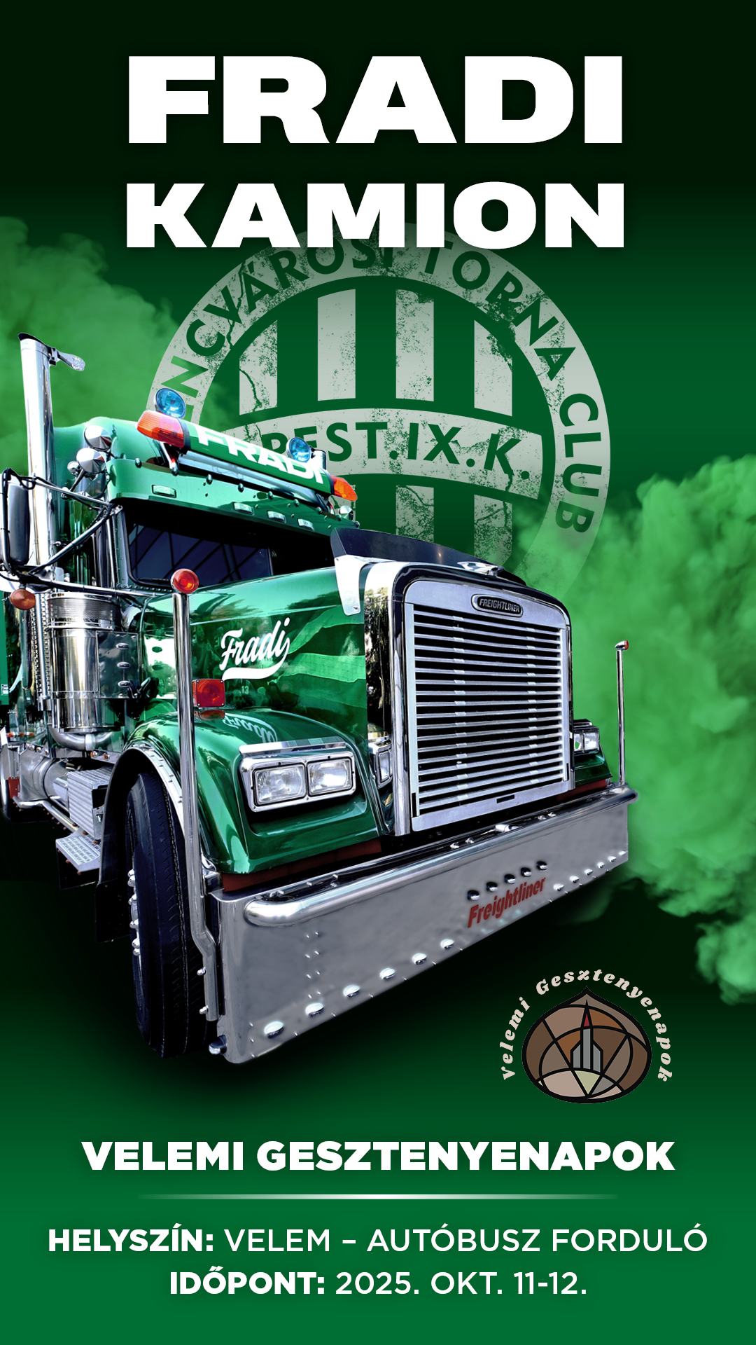 Október 11-12-én a Velemi Gesztenyenapokon az autóbusz fordulóban (Rákóczi utca) lesz látható a Ferencvárosi Torna Clubnak gyártott egyedi kamion melyben az alábbi aktivitások zajlanak: