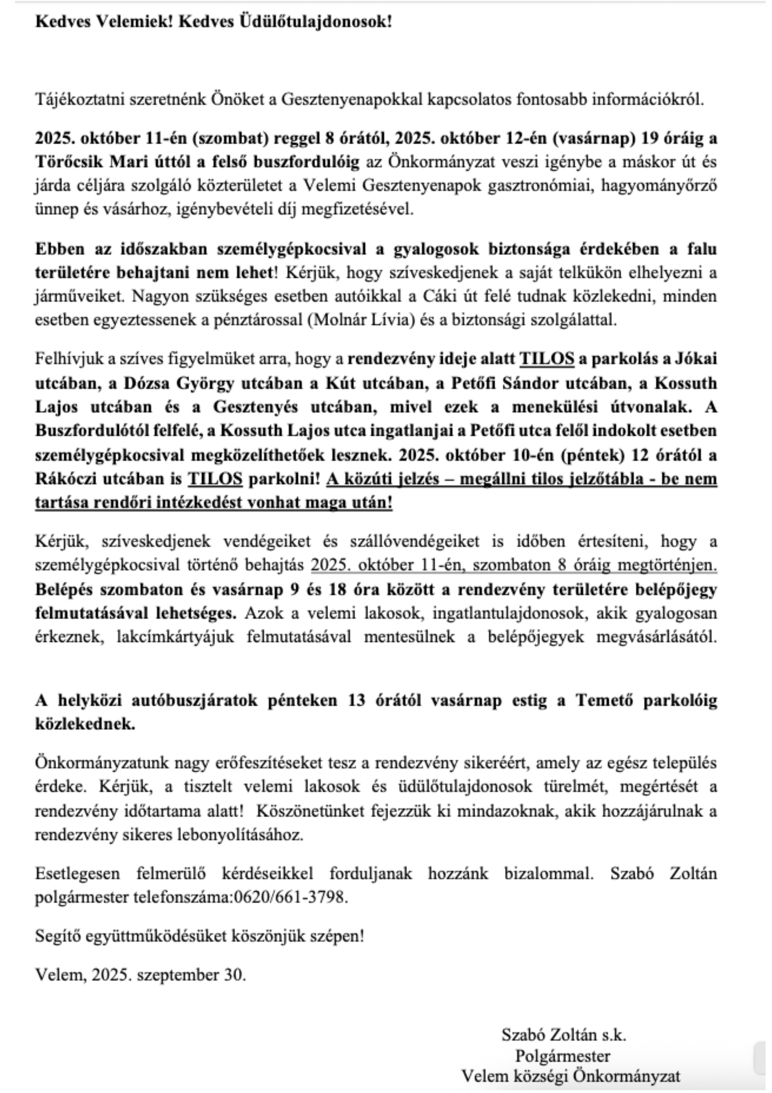 2025. október 11-12-én kerül megrendezésre, idén 32. alkalommal a Velemi Gesztenyenapok. Mindkét nap rengeteg program és látnivaló várja a kedves vendégeket.