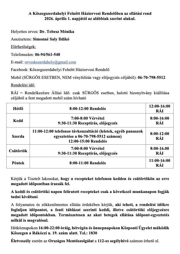 Kőszegszerdahelyi Felnőtt Háziorvosi Rendelőben az ellátási rend 2026. április 1. napjától